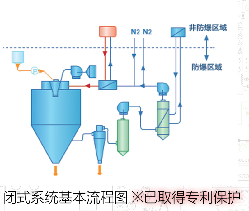 AKITA自主研發(fā)的CSD系列氮氣保護閉式循環(huán)噴霧干燥機,在傳統(tǒng)開放式噴霧干燥基礎(chǔ)上,將整個干燥流程改為封閉循環(huán)系統(tǒng),同時整個系統(tǒng)里面充滿氮氣,適合有機溶劑或易氧化物料的干燥。同時整套設(shè)備采用了防爆設(shè)計,避免了干燥過程中爆炸風險。